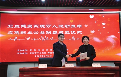青岛市中心血站和青岛市中心医疗集团在活动现场签署《卫生健康系统应急献血公益联盟协议书》。