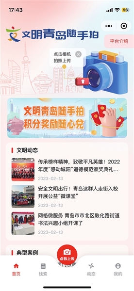 2023年是全国文明典范城市评选表彰年。今年,我市创建工作将更加注重常态化、长效化、精细化,更加注重解决问题、补齐短板和夯实基础,坚定落实“为民靠民惠民”的创建任务,切实把争创文明典范城市作为一场由市民打分、让市民满意的民生考试,书写文明典范城市的精彩答卷。举手投足皆文明,共创文明典范城。2月13日,记者从青岛市精神文明建设委员会办公室召开的新闻发布会上获悉,“文明青岛随手拍”微信小程序即日起正式上线。市民可以通过该小程序随时上传身边的不文明现象,有效线索将迅速获得相关部门办理反馈。