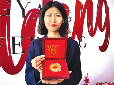 工作人员在展示李沧区为新人准备的结婚纪念章。 刘卓毅 摄
