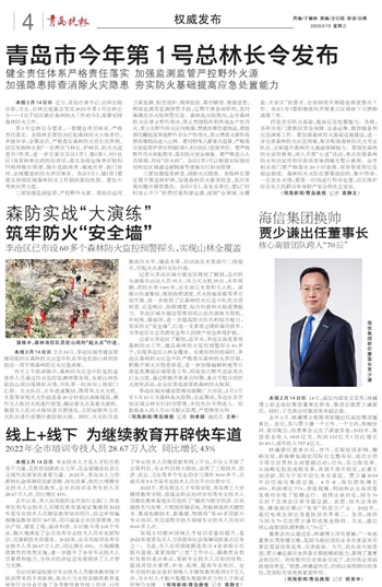 本报2月14日讯 近日,青岛市委书记、总林长陆治原,市长、总林长赵豪志签发2023年第1号总林长令——《关于切实做好森林防火工作的令》,部署安排森林防火工作。