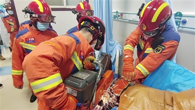 救援人员到场后发现,女子右手整个手掌都被卷进了绞肉机。绞肉机材质为合金钢,救援难度较大。家属和医生建议使绞肉机反向旋转,让女子尽快将手取出。但救援人员观察后发现,绞肉机内壁有与螺旋杆紧密贴合的螺槽,强行旋转势必会对女子造成二次伤害。救援人员决定用无齿锯切割、扩张器开口配合的方法施救。救援人员为被困女子做好防护后,一边用无齿锯纵向切割机身,一边使用医用盐水全程降温,最后用液压扩张器缓慢撑开机身。经过一个半小时的救援,女子抽回了手掌,医护人员立即展开救治。