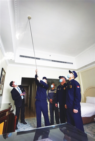 防火监督人员在测试检查一幢高层建筑内的烟感报警器。 刘卓毅 摄