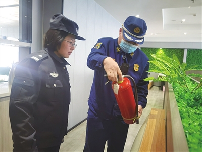 防火监督人员和民警在检查一家餐厅内的干粉灭火器。 刘卓毅 摄