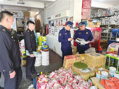 胶州市消防救援大队联合相关部门在检查消防产品。