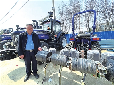 在合作社,姜永战向记者展示了他最新改造的铺设滴灌管装置。以往铺设滴灌管都靠人将管子一根根拉过去,费时费力;现在有了铺设农机,一趟四条管一口气铺完,大大提高了效率。“这个特别简单,稍微琢磨了一下,很快就改造出来了。” 姜永战的语气轻描淡写,经他改造的农机实在太多了,这种“小玩意”数不过来。
