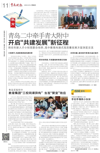 据悉,学科教学展示活动将在4月、5月分别走进崂山分校和实验初中本校,做到学科教学展示全覆盖。集团将紧紧围绕学科教研突破口,以师资队伍建设为抓手,以优化教育资源配置为载体,以资源共享、互助互动、优势互补为途径,精耕以教,形成“一体两翼齐头并进”的发展格局。 观海新闻/青岛晚报 记者 张琰