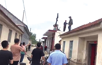 犯罪嫌疑人被警民合力堵在了房顶上。