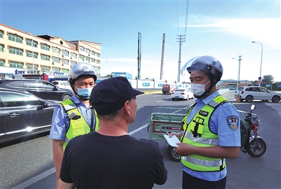 即墨交警文化路中队民警在墨城路地铁工地周边执勤,查处交通违法行为。刘卓毅 摄