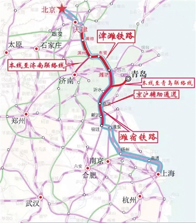 京沪二通道(又称京沪辅助通道)连接华北、华东地区,贯通京津冀、长三角等城市群,它由多段铁路连接而成。此次获批的潍宿高铁是京沪辅助通道中的最后一段,其他铁路均已开工或开通。