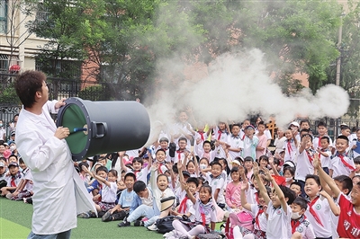青岛香港路小学学生在科技实验秀中学习气体“炮弹”相关知识。