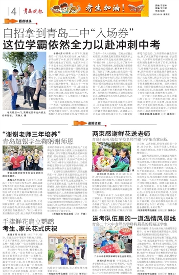 本报6月15日讯 15日下午3时许,在青岛五中考场外等候的人群里,不乏有手捧鲜花、等待庆祝的家长。“怎么样?有面儿吧!”一名女生获得家长递上的鲜花后,和身旁的同学笑着打趣。