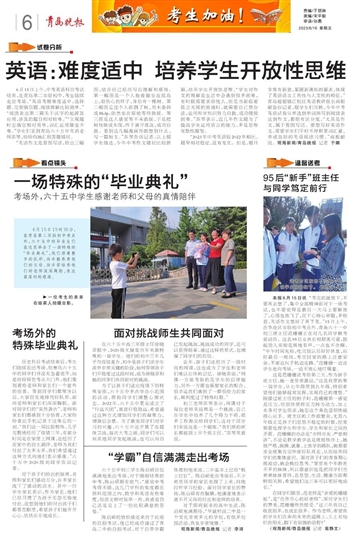 6月15日上午,中考英语科目考试结束,在青岛第二实验初中,考生陆续走出考场。“英语考题难度适中,选择题、完型填空题、阅读理解比较简单。”“阅读表达第二篇关于汉字的起源及应用,涉及的题目相对较难。”“主观题时态填空相对简单,词汇运用题也不难。”学生们见到青岛六十五中英语老师苏琴,纷纷向她汇报答题情况。