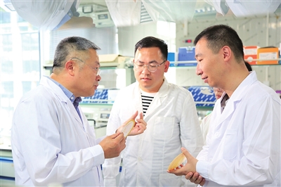 包振民(左)与同事们交流。