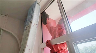 救援人员在摘除屋檐下的马蜂窝。