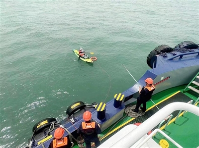 水手长范军携带救生圈,水手潘炎携带急救药品,机工张立桅、郗厚超搬运救生梯到达救生甲板。12时40分,备好救生器材和物资后,范军到船头、潘炎到船尾协助瞭望开展搜寻。很快当船舶到达第二警戒区时,在出口航道上发现失控的皮筏子和求救人员正随着海风和潮汐向航道中央飘去。