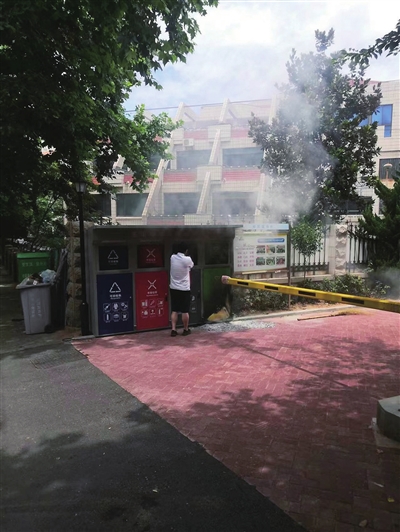 本报7月17日讯 17日中午12时10分,309路驾驶员杨振坤驾车由洛东小区发往辛家庄,运行至台北路附近观察前方路况时,发现路旁一个垃圾分类箱内冒出滚滚浓烟,不时有火苗蹿出。