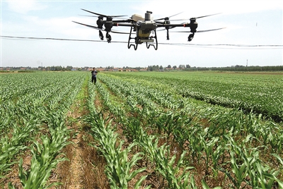 无人机在即墨区的田地间进行植物保护作业。