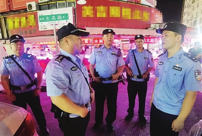 在台东步行街警务站,市北刑警九中队中队长辛克伟和同事从晚8时许开始徒步巡逻。“我在派出所干过,还当过110民警,现在是刑警。”从警30多年,辛克伟练就了锐利的目光。刑警上街巡逻,虽然是从“剑”到“盾”的转变,但这难不到辛克伟。