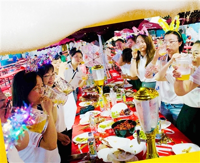 游客在啤酒大篷内举杯畅饮。栾丕炜 摄