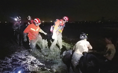 本报8月2日讯 8月1日深夜,青岛西海岸新区红柳河路小殷圈附近滩涂发生险情:七人在赶海时,因为不熟悉海况身陷淤泥。青岛开发区消防救援大队到场后经过3个多小时的救援,将他们救上岸。
