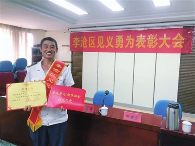 7月26日上午,李沧区召开见义勇为模范表彰会。因路遇货车侧翻爬车救人一事,陈海峰被评为李沧区“见义勇为模范”,获得了3000元奖金。