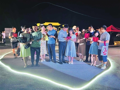 在海之恋公园举办的七夕活动中,新人诵读婚书。栾丕炜 摄