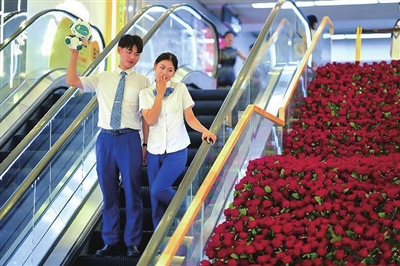 本报8月22日讯 22日,青岛地铁3号线双山站因为“粉红泡泡”四溢而“出圈”,7000朵玫瑰打造的玫瑰瀑布,心形彩绘打造的“心动扶梯”,吸引了众多市民前来打卡拍照。记者在双山站A出入口看见,玫瑰瀑布和心动扶梯前满是排队市民,大家有序等待,依次上前拍照。“前几天从网上看到消息后,就想着过来打卡纪念,随便拍拍就是美照。”市民陈女士和男友说。