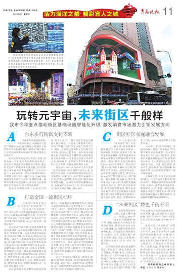 街区是满足市民对美好生活向往的重要城市窗口,是智慧城市和城市商业体建设的重要内容,也是促进流通创新、消费繁荣的重要载体。今年,青岛重点推动街区基础设施智能化升级,探索利用元宇宙、无人驾驶等技术打造未来街区示范。
