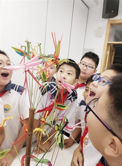 开学首日,青岛金门路小学迎来了以“共读万卷诗书,传承文化力量”为主题的开学典礼。今年的开学典礼为学生们准备了不一样的惊喜——全校学生深度体验包括“民间糖画”“民间结艺”在内的十二项非遗项目,让学生们充分感受传统文化的魅力。以《长安三万里》电影里的唐诗为引,一群身着汉服的学生登台献演了《诗词知识歌》和《诗词导游团》两场精彩的节目。随着全场合唱《少年中国说》,整个会场的氛围达到了顶点,每个学生都在大声歌唱,散发着独属于少年的光芒。随后,学生们欢快地走进非遗项目所在的教室,跟着各位民间艺人,汲取传统文化的养分。系中国结、捏面人、编花绳、编草人……经过一场传统文化的洗礼,同学们带着理想与目标迎接新学期的到来。