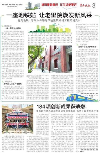 “青岛地铁充分发挥地铁出入口的区位优势,努力打造集民宿、餐饮、休闲娱乐等业态为一体的文旅地标,以适度商业运营助力历史街区生命力重现,建设好‘轨道上的青岛’,推动历史城区可持续、高质量发展。”王勇介绍说。项目建成后,将成为撬动西部老城复兴的重要支点,重塑产业与空间关系,重聚历史城区人气,让历史城区成为建筑可阅读、街道可漫步、城市可记忆的“文化客厅”。据悉,在青岛地铁集团主导下、在中建八局发展建设公司等参建各方的共同努力下,青岛地铁1号线中山路站风貌建筑修缮工程已经成为展示青岛老城区文化的亮丽名片,并即将全面投入使用。项目对更新城市面貌、改善人居环境作出的突出贡献,得到了历史城区保护更新指挥部及相关各方的一致肯定,并被纳入青岛市历史城区保护更新十大经典案例。