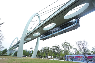 作为一种新型立体交通工具,该列车的轨道由钢结构立柱支撑在空中,车体悬挂于轨道梁下方,在半空中行驶,有“空中列车”之称,极具科幻感。