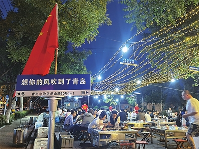 10月2日傍晚,记者在虎山路秀峰路路口东侧看见,太阳刚下山,“李村河底烧烤戳子肉”东侧的一处小广场上,数十张饭桌上已坐满了食客。小铁盒内的五花肉和牛羊肉经过炙烤,散发出诱人的香气。灯光下觥筹交错,年轻的面庞尽情绽放着笑脸。