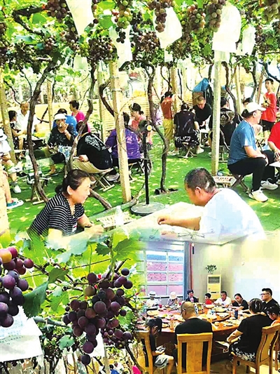在葡萄园内,游客们还可以坐着马扎,在桌子上喝喝茶,聊聊天。中午饿了,还可以吃一顿地道的农家宴。“今年假期没去太远的地方,就带着孩子来近郊采摘水果,感受大自然也挺好。”从市北驾车来的李女士说。