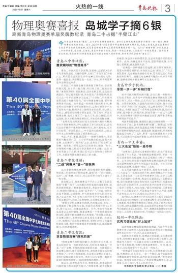 在青岛二中物理竞赛首席教练王林看来,李沛霖性格沉稳,自主学习能力强,所以刚上高二就能出成绩。“拿到奖牌的时候挺激动,这次发挥正常,还是比较满意的。”回忆起领奖时刻,李沛霖说:“获得银牌,代表自己这一年多的竞赛学习达成了‘小目标’,明年要向着更高的目标继续努力。”他与物理竞赛结缘,要从物理科普书说起。“初中看过一些物理方面的科普书,像是相对论和量子力学的基础知识,让我对物理学产生了浓厚的兴趣,物理学史上物理学家的故事,则让我心向往之,感觉研究物理非常有意思。”到了高中,听说有物理竞赛,他先上网买了一些入门书,自己做题,后经过选拔,加入学校物理竞赛队伍,开始系统接触竞赛。