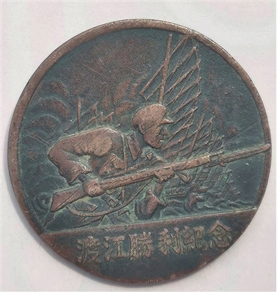 妈妈边说边拿出钥匙打开小匣子,一枚古铜色的纪念章展现在我面前。纪念章正面雕刻着一位手端长枪、奋勇前进的战士,他的侧面是劈风斩浪的战船,下面刻着“渡江胜利纪念”六个雄健有力的字。背面刻着“中国人民解放军华东军区”,落款时间为一九四九年四月二十一日。这枚纪念章是我太姥爷参加渡江战役所得。