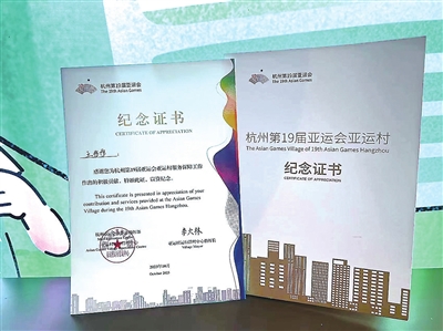 彤彤参与亚运会亚运村服务保障的纪念证书。