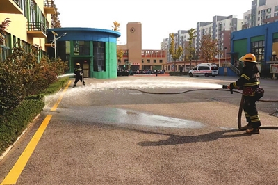 当天,随着警报铃声响起,消防安全疏散演练开始:老师引导学生们低头弯腰、捂住口鼻,靠右有序撤离到操场空旷处。随后,消防车到达现场,消防员将“大火”扑灭。(观海新闻/青岛晚报/掌上青岛 记者 刘卓毅 通讯员 张静)
