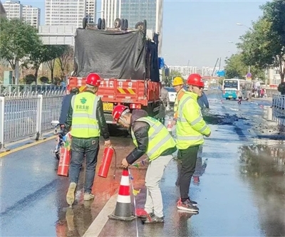 11月13日上午9时,劲松七路与合肥路路口热力管道发生爆裂。5号线合肥路站的现场施工人员听到声响后,第一时间组织人员奔赴现场查看情况。当发现是热力管爆裂导致路面破损后,施工负责人立即下达指令,带领施工人员利用警戒线、锥形帽等警示标识设施,准确而迅速地划定了警戒范围,有序引导车辆和人员离开现场。在确保途经车辆及过往人员安全后,施工人员协助热电公司清理路面,凭借施工经验,迅速而高效地完成了清理工作。