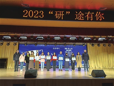 本报1月26日讯 1月25日,青岛第五十三中学教育集团在青岛中央商务区实验学校大报告厅召开以“2023‘研’途有你”为主题的首届集团教学年会。会上,集团两所学校——青岛第五十三中学、青岛中央商务区实验学校的272位一线教师组成的14支团队现场送祝福,“语数英”三个学科组带来说课集备展示、两所学校老师带来创新作业、精品课程开发和研究性学习经验分享,名师讲座、颁奖典礼……年会聚焦深度教研和持续科研,营造教科研浓厚氛围,推动教科研成果实践转化。