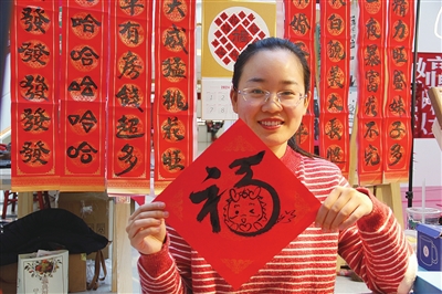 2月6日,在崂山区金狮广场的新年市集上,龙形灯笼、龙形创意福字、龙形手工木制品、手工舞龙,从十几元到上百元的龙年装饰品琳琅满目,红红火火,非常吸睛。一处摊位吸引了记者的眼球,摊位上摆着琳琅满目的新年摆台、福字、对联、卷轴等创意文字产品。家住市南区的沐槿是创意福字的摊主,她边说边在一张红色的字画纸上用行书写下福字,与传统福字不一样的是,这个字的右边,加了一个可爱的小龙头模样,为新年增加了一些快乐元素。