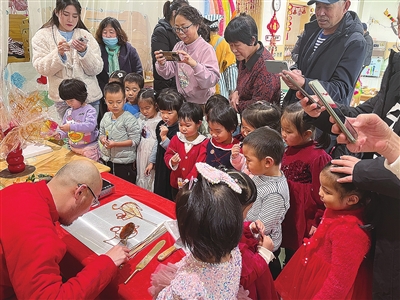 糖画艺人周丕春制作糖画吸引了不少大人小孩围观。