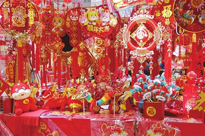 青岛崂山一商场年味市集上红红火火的新年装饰品。
