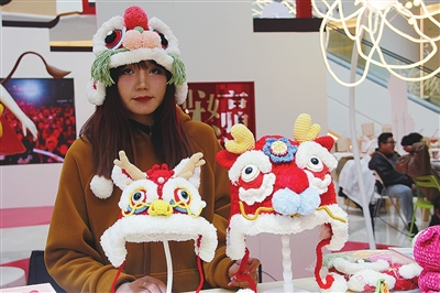 金狮广场市集里摊主于小九展示自己手工织的龙头帽。
