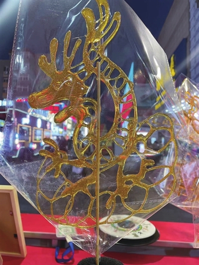 青岛市非遗传承人糖画艺人周丕春制作的糖画龙。