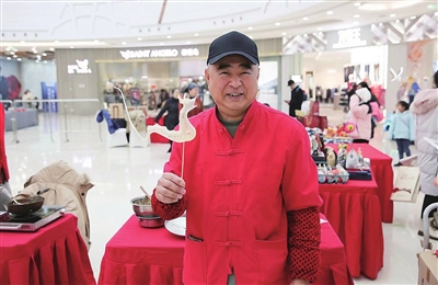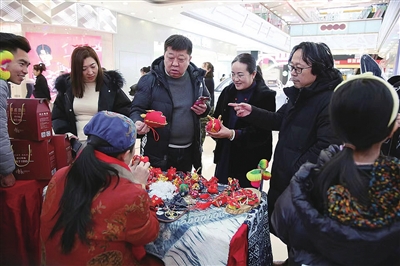 2月5日上午,记者在李沧区万达广场的非遗手造市集上,非遗传承人和民间艺人展示了剪纸、吹糖、糖画等精湛技艺,十余种非遗手造体验展销项目吸引了前来采购年货的市民。