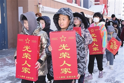 本报2月7日讯 5日,平度市凤台街道幸福里社区东潘家疃网格村格外热闹,锣鼓声响彻整个村庄,8名少年儿童每人手里捧着一盏写有“光荣人家”的“光荣灯”走在前面,不时喊着“一人当兵,全家光荣”“参军光荣,保家卫国”的口号,村干部、村民代表、小学生一起敲锣打鼓,带着福字、花生油、大米、酒等慰问品,来到8户军属家中,为他们挂“光荣灯”,送上全村人的温暖和祝福,以感谢他们对祖国国防事业作出的贡献。