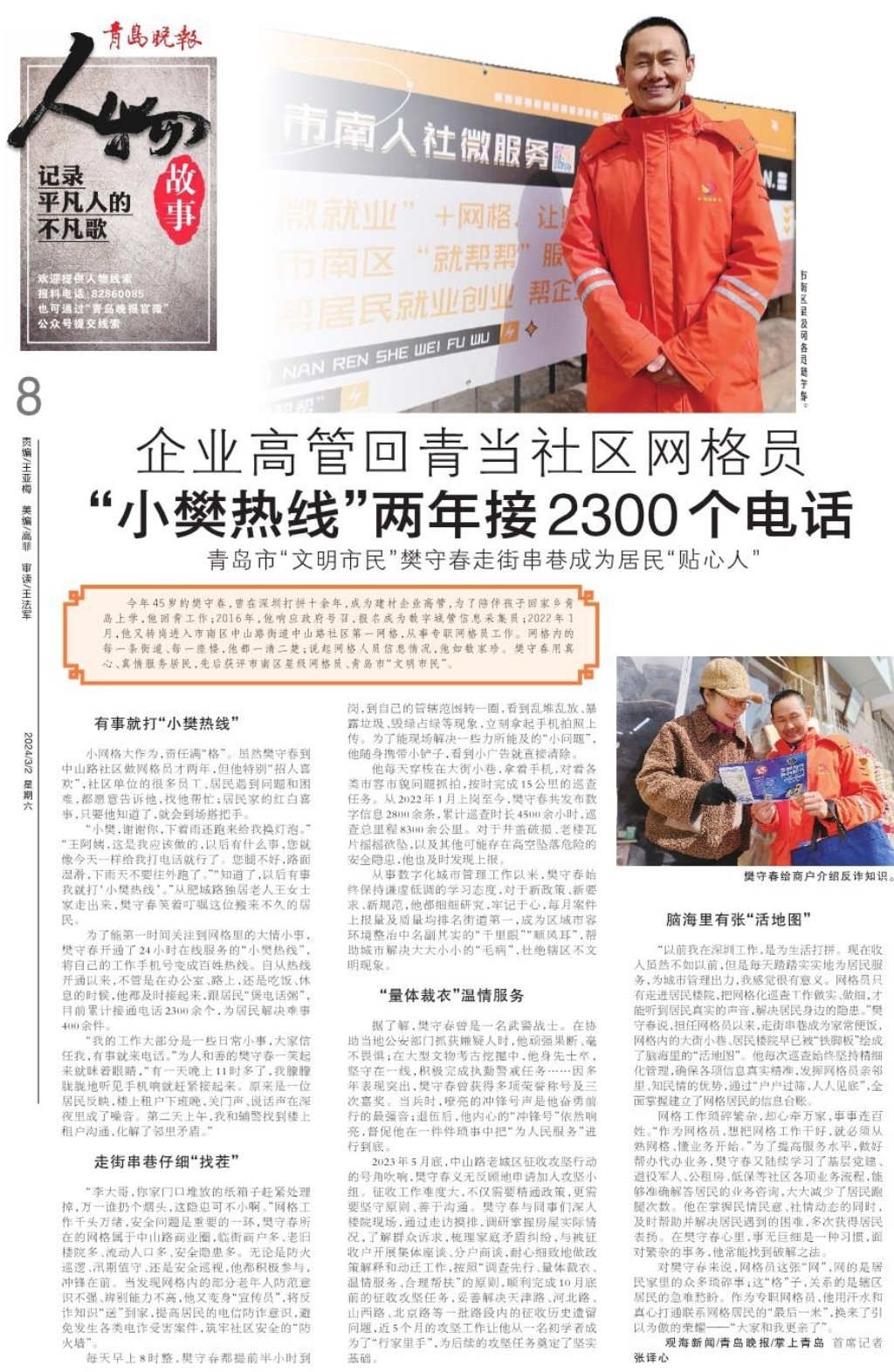 企业高管回青当社区网格员 “小樊热线”两年接2300个电话