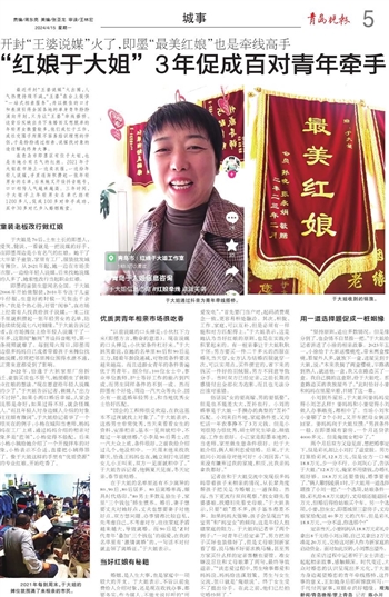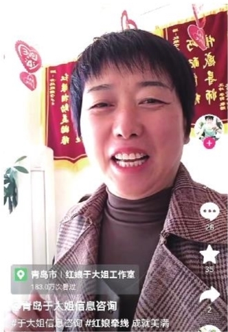 在青岛市即墨区有位于大姐,也是当地小有名气的红娘。2021年于大姐在市场上一边卖衣服,一边给年轻人说媒,手里逐渐积攒起一张年轻男女的名单,后来她又开设抖音账号,口口相传人气越来越高。三年时间,于大姐手上年轻男女名单已经有1200多人,促成100多对牵手成功,其中30多对已步入婚姻殿堂。
