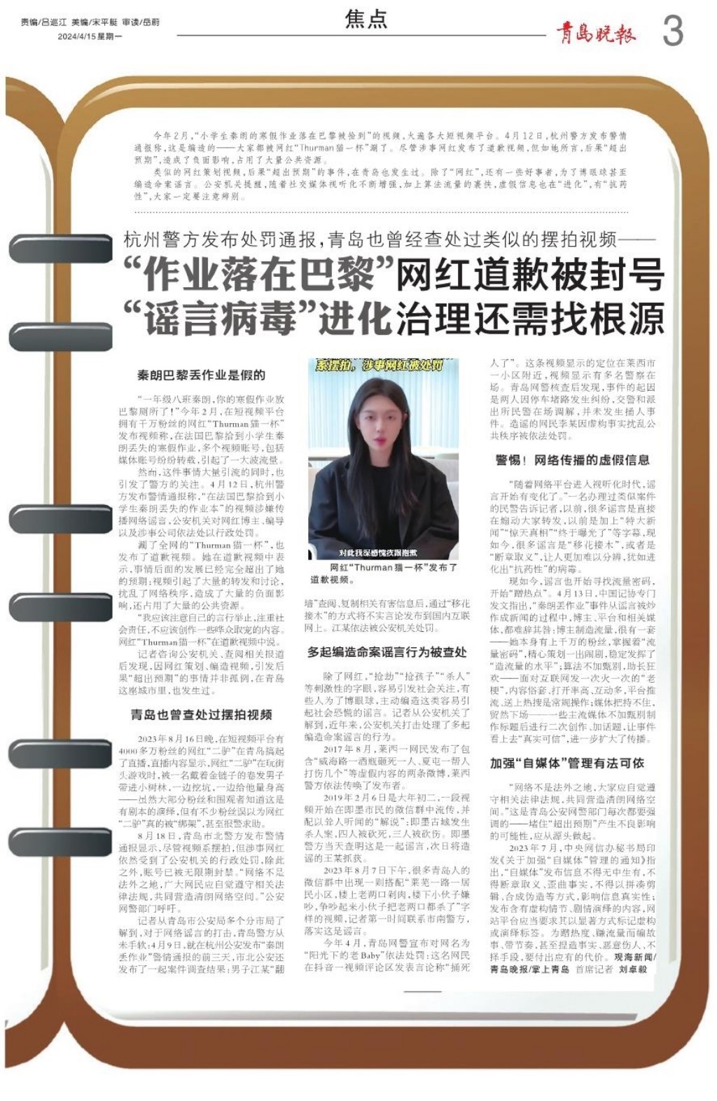“作业落在巴黎”网红道歉被封号 “谣言病毒”进化治理还需找根源