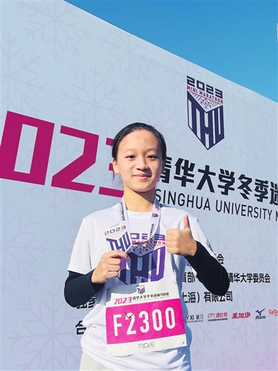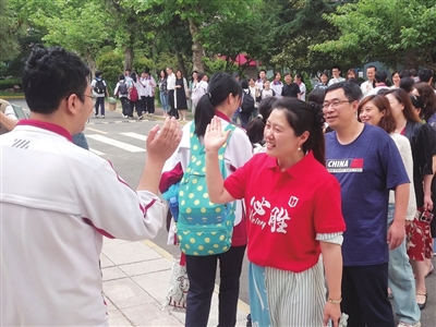 青岛十七中老师们(右)排起长队与同学们轮流击掌鼓劲。范胜瑶 摄